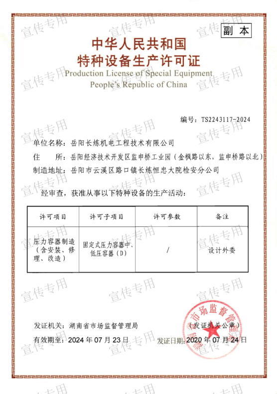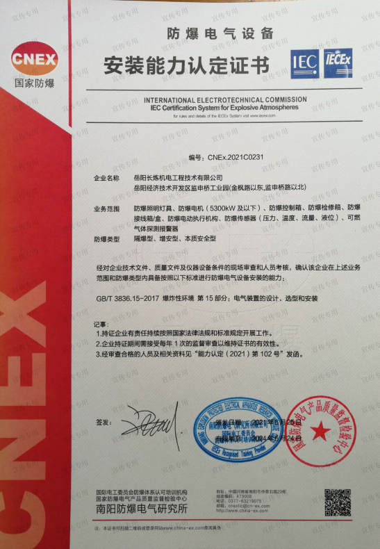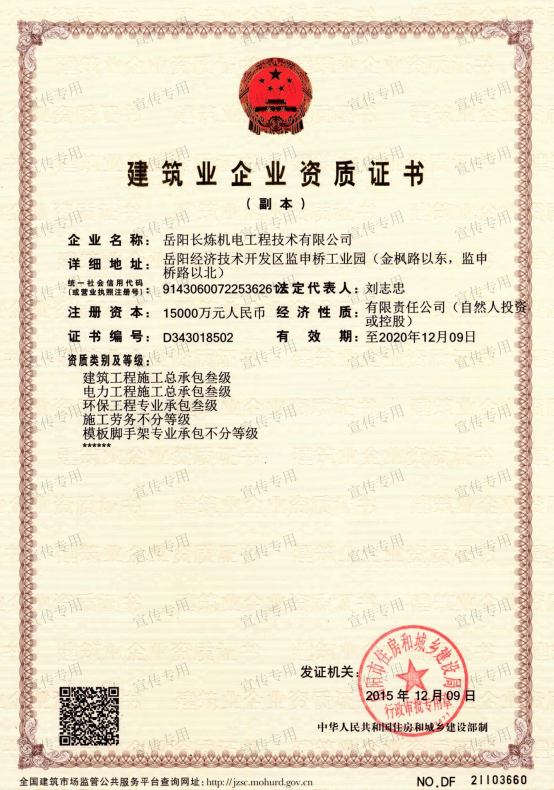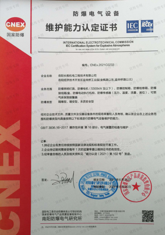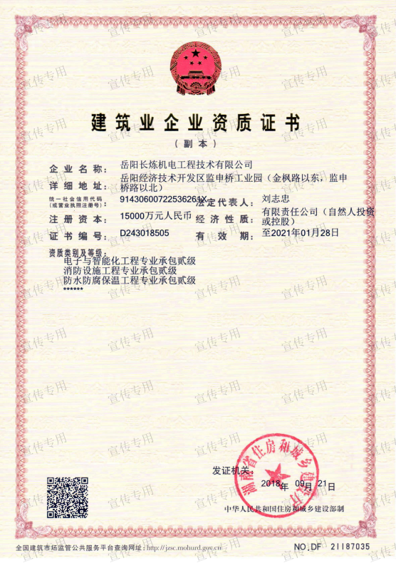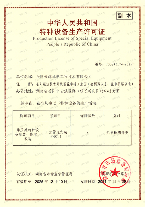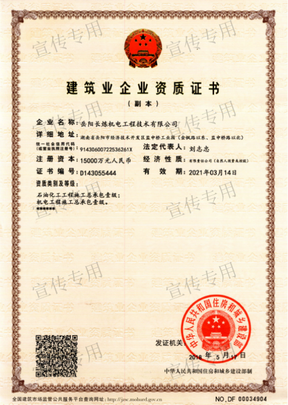 公司擁有石油化工工程施工總承包壹級資質(zhì)、機(jī)電工程施工總承包壹級資質(zhì)、檢維修能力評定(9大類38項(xiàng))、建筑工程施工總承包叁級資質(zhì)、電力工程施工總承包叁級資質(zhì)、環(huán)保工程專業(yè)承包叁級資質(zhì)、消防設(shè)施工程專業(yè)承包貳級資質(zhì)、防水防腐保溫工程專業(yè)承包貳級資質(zhì)、電子與智能化工程專業(yè)承包貳級資質(zhì)、施工勞務(wù)不分等級資質(zhì)、兩化(工業(yè)化、信息化)融合管理體系認(rèn)證、A級工業(yè)設(shè)備高壓水清洗資質(zhì)、特種設(shè)備生產(chǎn)許可證(中、低壓壓力容器制造(含安裝、修理、改造)(D))、特種設(shè)備安裝改造維修許可證(壓力管道)GC1級、特種設(shè)備安裝改造維修許可證(鍋爐)1級、特種設(shè)備安裝改造維修許可證(起重機(jī)械)B級;特種設(shè)備檢驗(yàn)檢測機(jī)構(gòu)核準(zhǔn)證(安全閥定期校驗(yàn))檢驗(yàn)項(xiàng)目FD1、FD2、承裝(修、試)電力設(shè)施許可證(承裝類二級、承修類二級、承試類三級)、防爆電氣設(shè)備安裝、修理資格證書、計(jì)量標(biāo)準(zhǔn)考核證書的二氧化硫氣體檢測儀檢定裝置、硫化氫氣體檢測儀檢定裝置、熱電偶標(biāo)準(zhǔn)裝置、可燃?xì)怏w檢測報(bào)警器檢定裝置、精密壓力表標(biāo)準(zhǔn)裝置、一氧化碳檢測報(bào)警器檢定裝置等企業(yè)資質(zhì)。公司通過了中國質(zhì)量認(rèn)證中心QHSE管理體系認(rèn)證,是中石化施工企業(yè)資源庫A庫成員,湖南省建設(shè)網(wǎng)成員單位,湖南省高新技術(shù)企業(yè)。